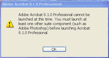 Acrobat 8.1.0 프로페셔널을 실행시키기 전에  반드시 적어도 하나의 다른 컴포넌트(Adobe 포토샵같은)를 실행시켜야만 합니다.